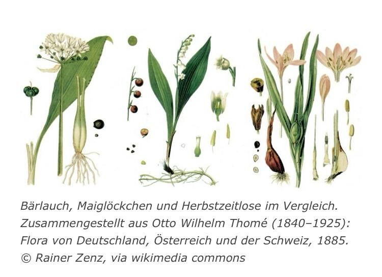 Aber Achtung! Wer ihn sammeln möchte, sollte sich damit auskennen, denn der Bärlauch hat zwei gefährliche Doppelgänger: Maiglöckchen und Herbstzeitlose sehen zum Verwechseln ähnlich aus, sind jedoch giftig. Bärlauch hat zwar einen unverwechselbaren Geruch, wenn man ihn zwischen den Fingern zerreibt. Tut man das aber mehrmals, haftet der Geruch an den Fingern und kann die Wahrnehmung verfälschen.