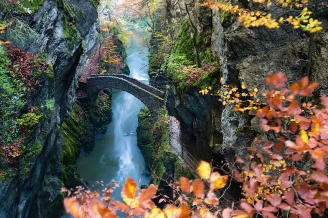 Unterwegs im Land der Feen: Alte Steinbrücke in der Areuse-Schlucht